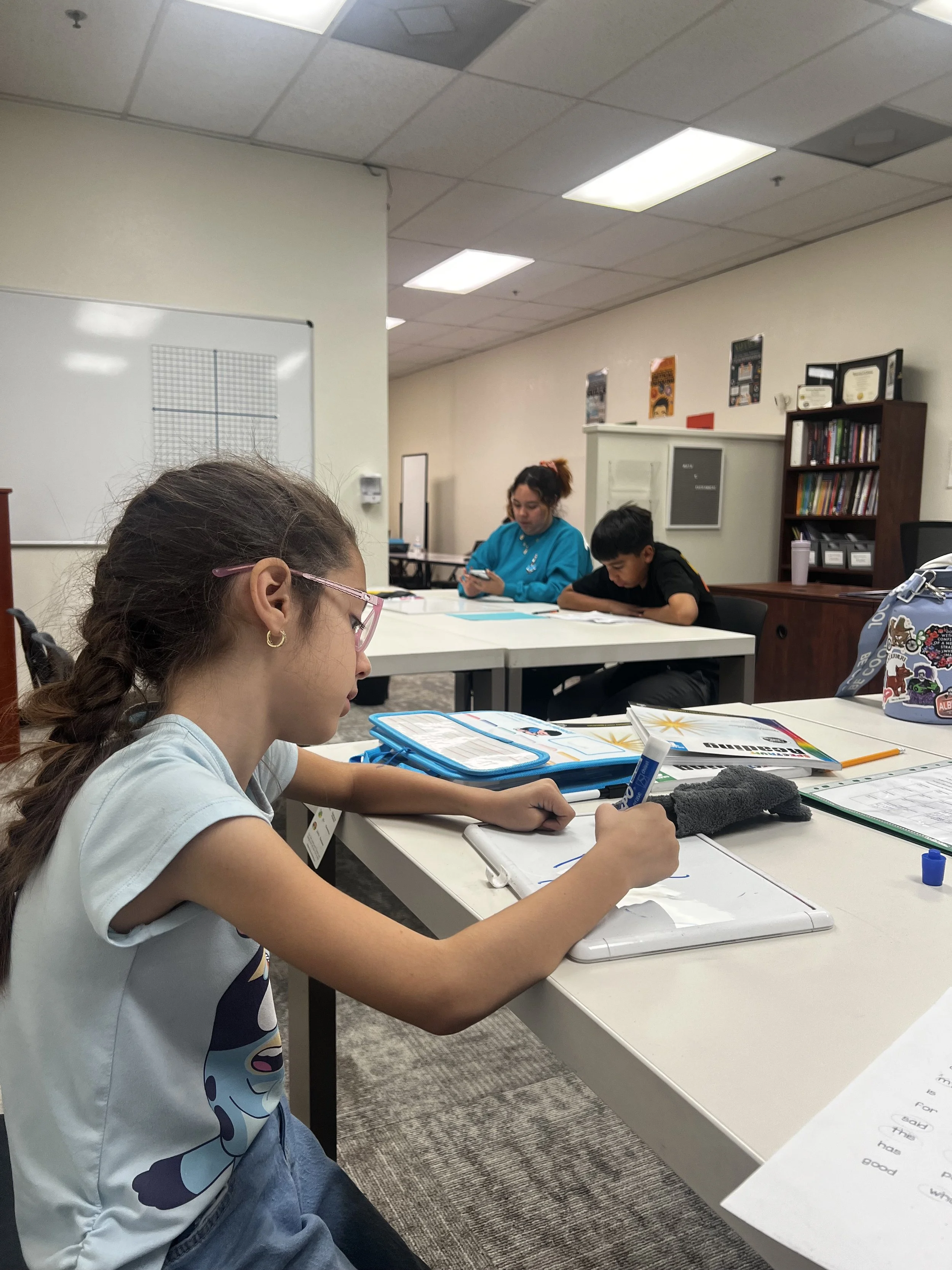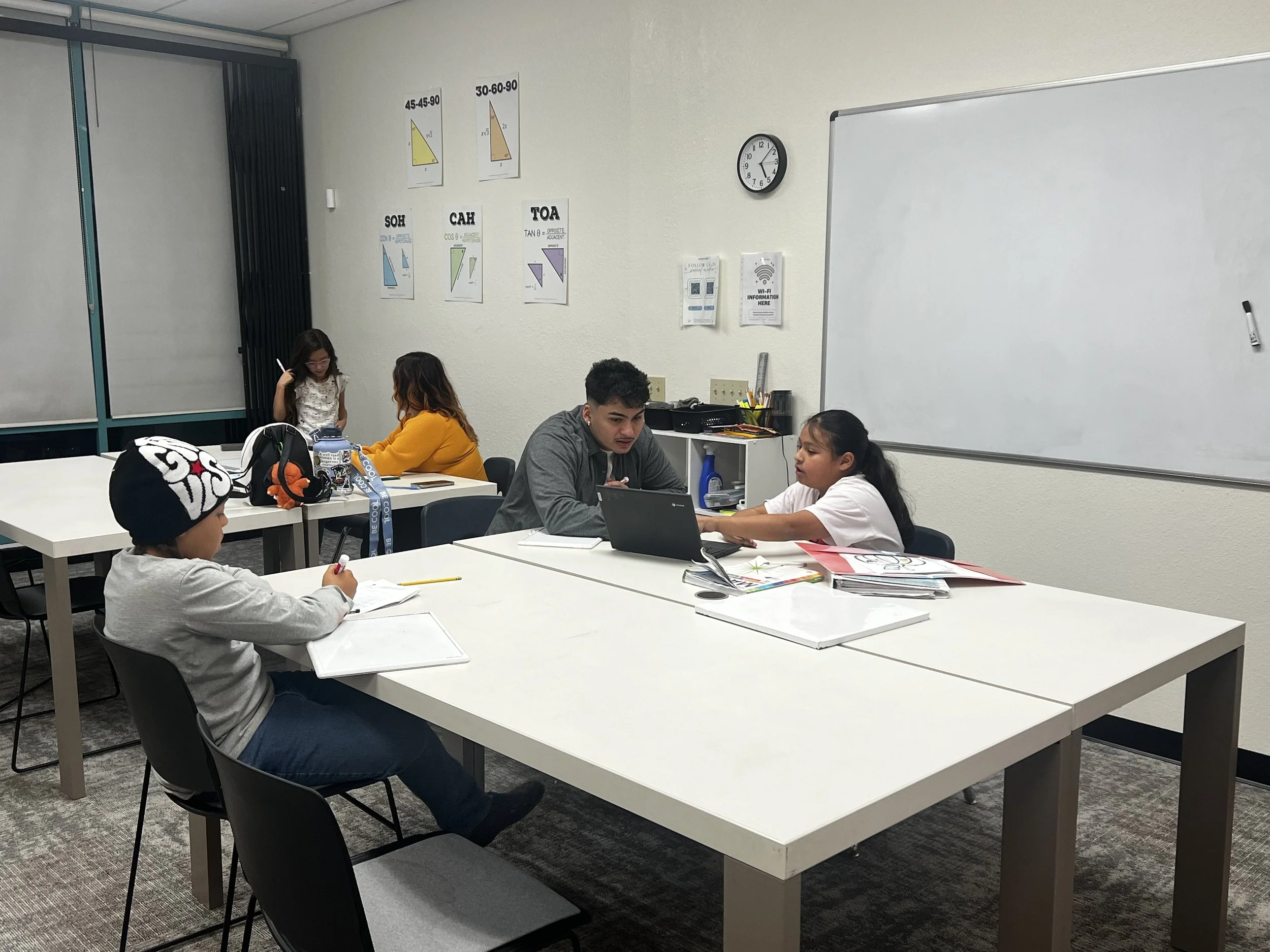 Our group tutoring sessions provide a collaborative and supportive environment where students engage in academic discussion and build confidence alongside their peers. With access to whiteboards, textbooks, and independent study spaces, students are equipped with the tools they need to succeed. Our instructors are trained to align instruction with each student’s classroom curriculum, offering direct support on homework and class material. In addition to enrichment opportunities for advanced learners, we offer a targeted intervention curriculum for students who need extra support in building foundational skills. Whether it’s strengthening core concepts in math or improving reading and writing in English, our program is designed to meet students where they are and help them grow.